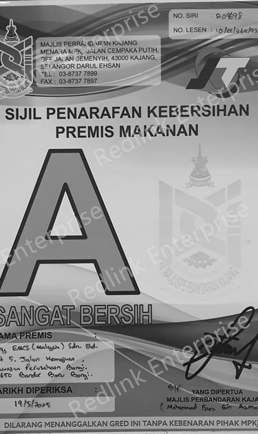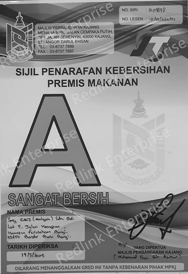 We are proud to announce that within our service area, our restaurant has been awarded the highest "Sangat Bersih" (Very Clean) hygiene rating certificate by the Kajang Municipal Council (MPKj). This achievement certifies that our food safety, environmental hygiene, and management systems fully comply with and exceed the standards set by Malaysian local authorities