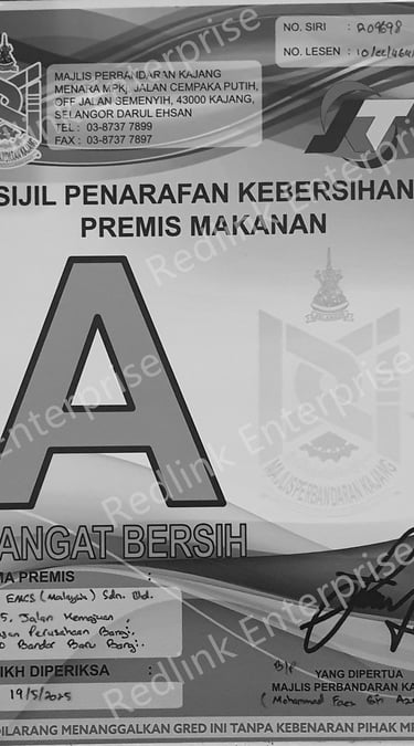 (Very Clean) hygiene rating certificate by the Kajang Municipal Council (MPKj)